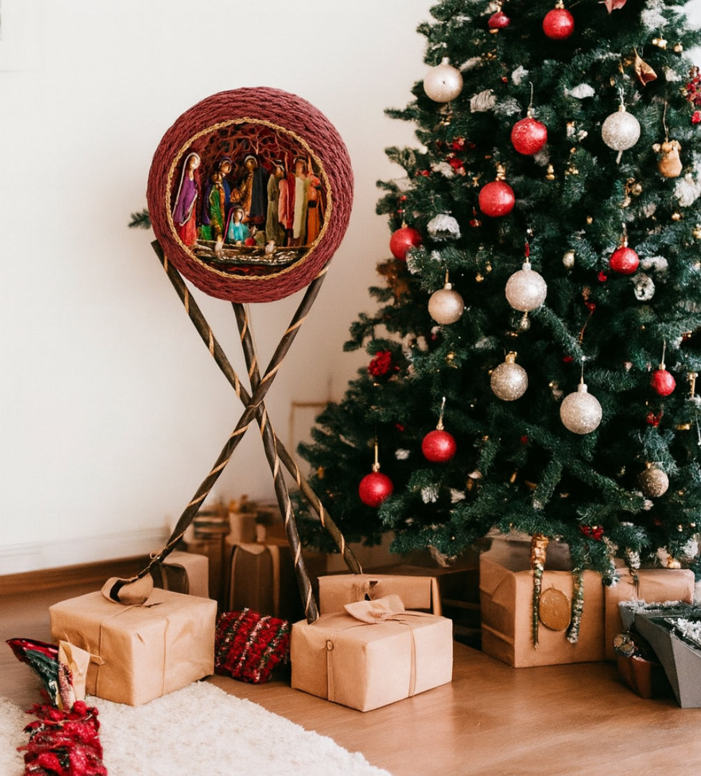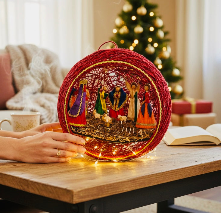 Beautiful handmade Nativity Set made of Corn Husk in a large twain ornament. Total length is 54 inches, large ornament is 11 inches.
